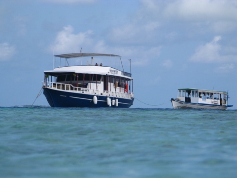 We are here to scuba dive and it’s Marci’s very first dive since her certification earlier this year. After arriving in Male, the capital and only airport, we spend the night at a local hotel and arise early to meet up with the motor vessel Sea Queen, our home for the next four nights. Sea Queen has 11 guests aboard including us, plus a crew of two dive masters and five staff. We head out of the channel to our first spot for an easy make sure everyone is okay dive and we get “kitted up” as they say and jump into the water. After a minute of acclimation and adjustment, we make our first decent. Marci is a natural and also, it turns out, a very good luck charm. Within the first six minutes of our first dive I look to my left and there, swimming beside me, is a young whale shark about seven feet long. This is rare, remarkable and damn lucky! Whale sharks are gentle and harmless, they have no teeth and can grow quite large. This youngster is as cute as can be and we are ecstatic! Being a new diver and not a familiar with the local variety, Marci was not so impressed as she just assumed all the fish in the Maldives were this big! (by the way, it took our dive master 400 dives in the Maldives to see his first whale shark)